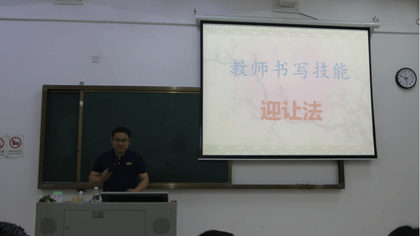 杨彬老师的教师书写技能是一门实训课程,主要培养学生作为师范生应具备的书写能力。杨老师以“担夫争道”这一书法典故为楔子,引出本堂课的知识点——“迎让法”。通过大量的书法练习帮助学生掌握迎让法中“互让”“穿插”和“伸缩”的技法。