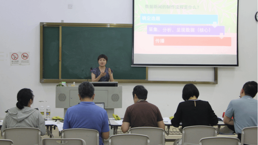最后上台的党宁老师参赛的课程是数据新闻与可视化。党老师旁征博引地引导同学们认识数据可视化的几种数据表格类型,深厚的知识积累和逻辑清晰的讲授过程引得评委们频频点头,也为本次青年教师教学竞赛画下完美的句号。