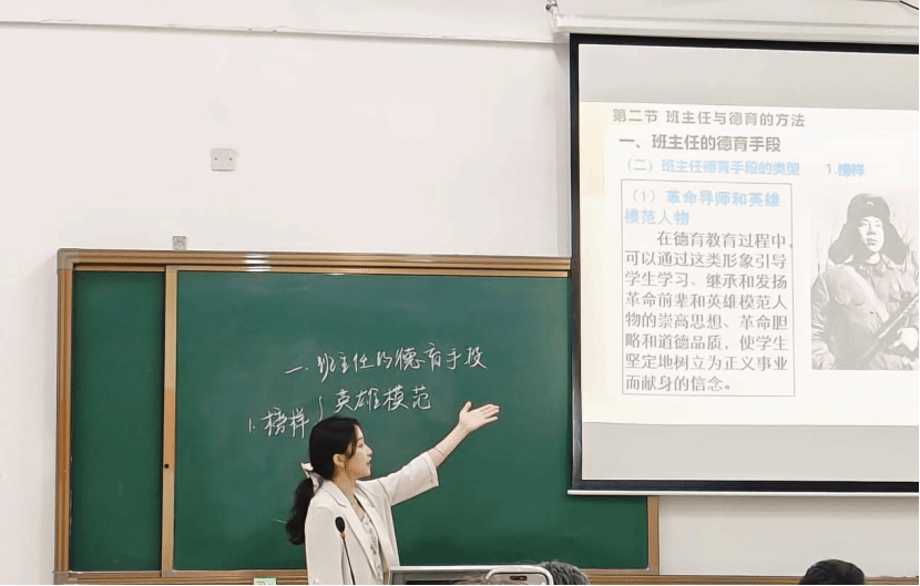 吴皖琼老师汇报的课程是德育教育与团队班主任工作。吴老师在汇报过程中展现出良好的教师语言、教师仪态,声情并茂地从英雄模范、历史人物、同学同伴、教师家长四个方面说明了班主任德育教育中榜样的作用,教学氛围活跃,内容简洁明了。