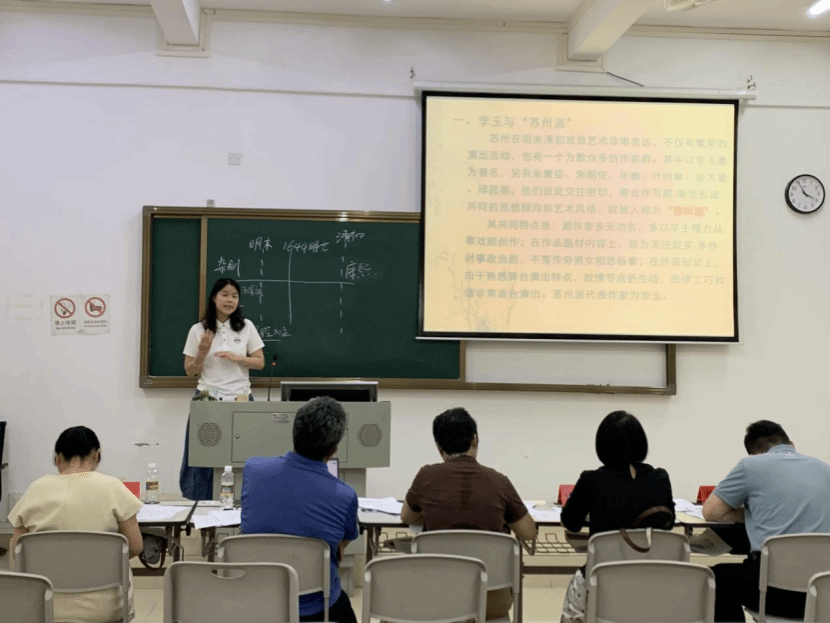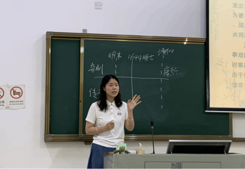 陈熙雨老师的汇报课程为清代戏曲。她以时间线为逻辑线索,将明末清初戏剧文学的发展历程娓娓道来,并重点分析了明末清初戏曲流派的类别和形成背景,内容翔实,思考深入。
