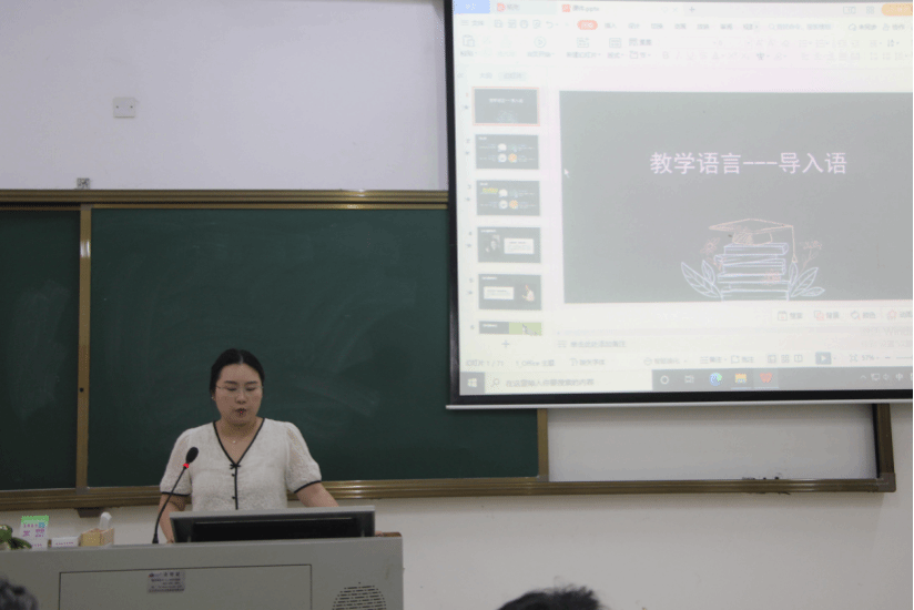 欧阳群堃参赛的课程同样是教师语言。欧阳老师系统性地梳理了导入语的含义、功能、类型和运用要求。在教学设计上,运用课堂实例的方法辅助学生理解知识点。在英语课实例探析中,欧阳老师运用了双语教学,展现对外汉语教育专业年青教师的风采。