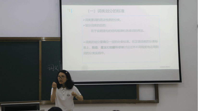 王玉清老师作为首先展示的教师,带来了现代汉语课程的内容。她从词类的划分标准和汉语词类系统切入,深入浅出地剖析现代汉语的语法体系,为本次比赛开了一个好头。