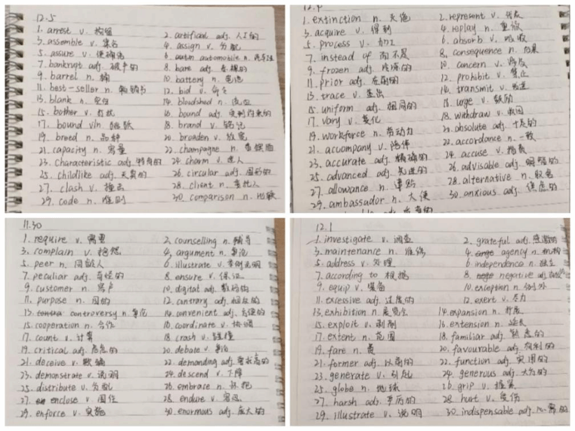 从11月16日到12月6日,学习小组利用线上平台持续开展互助打卡活动。小组成员们在相互监督下,每天致力于学习和记忆至少10个四六级相关单词。同学们通过在多个学习平台上建立打卡小组,并在活动QQ群中定期分享每天的学习成果。这种持续的日常积累策略显著提升了学习效率和积极性,也强调了持之以恒的积累对于学习的重要性。