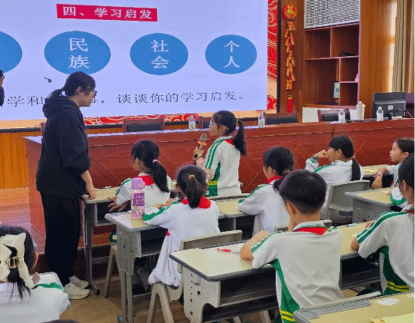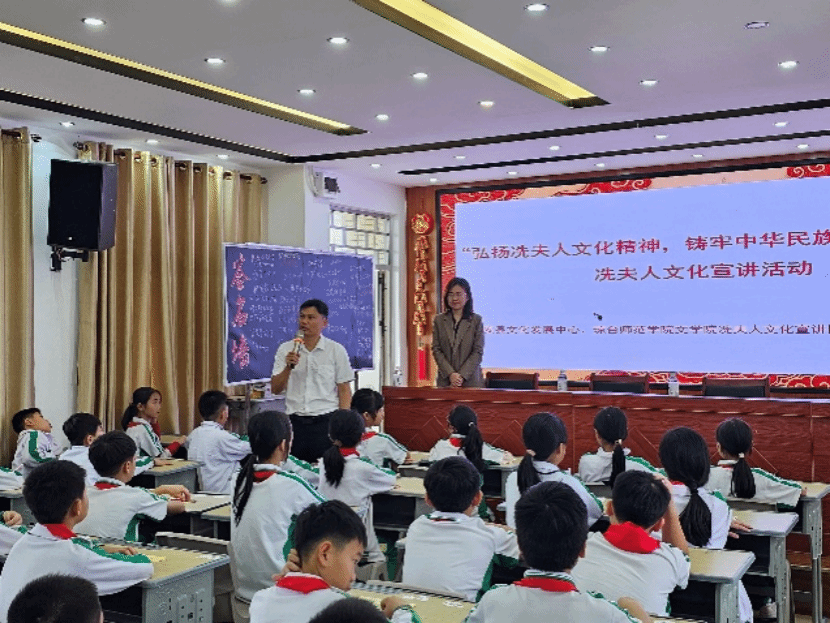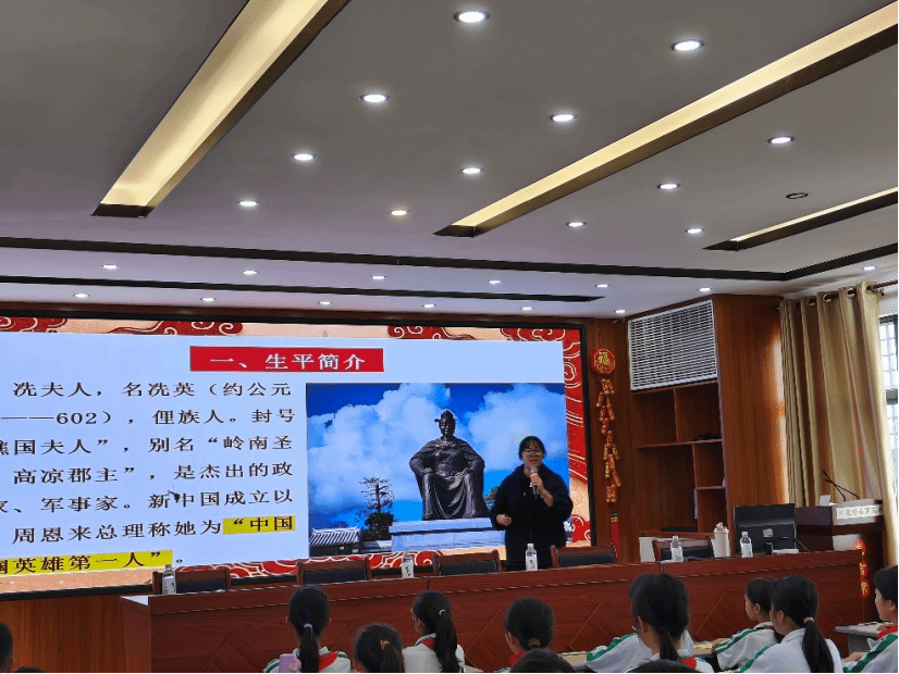 为加强当代青少年学生对中华民族共同体意识的理解,增强当代青少年的民族自信心和爱国情怀,2025年3月10日,在琼台师范学院文学院马中力老师的带领下,文学院冼夫人文化宣讲团来到定安县第三小学进行“弘扬巾帼英雄冼夫人精神,铸牢中华民族共同体意识”主题宣讲活动,为该校学生带来了一堂“行走的思政课”。