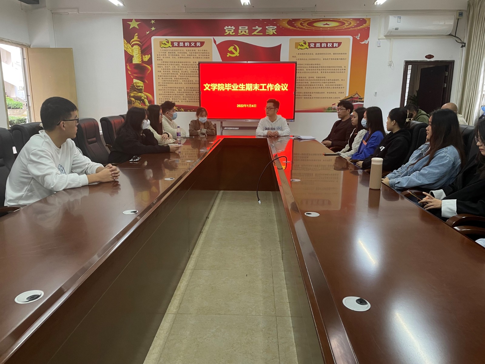 2022年1月4日下午,在文B105会议室召开了文学院毕业生期末工作会议,文学院党总支书记陈晓波同志、文学院学生党支部书记植远同志、张余萍老师、刘成功老师、王慧元老师以及19级语文教育专业和20级汉语言文学专业(专升本)学生代表参加了本次会议。