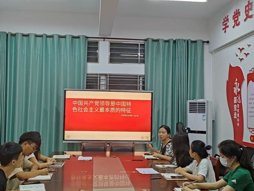 习近平新时代中国特色社会主义思想是引领党和人民为实现中华民族伟大复兴不懈奋斗的伟大精神旗帜。为了深入学习贯彻习近平新时代中国特色社会主义思想,文学院学生党支部于2023年5月23日在文科楼A栋104召开关于“中国共产党领导是中国特色社会主义最本质的特征”专题理论学习分享会,本次会议由潘虹老师主持。