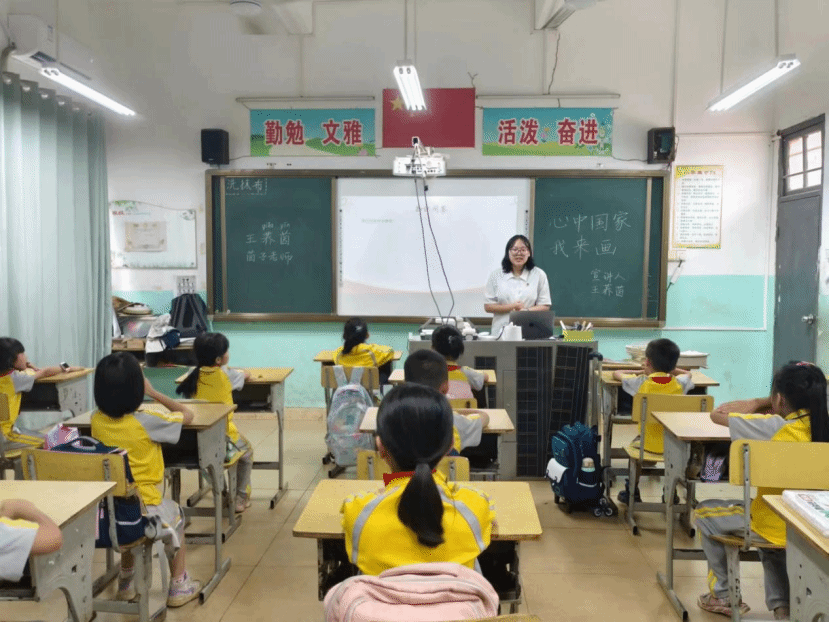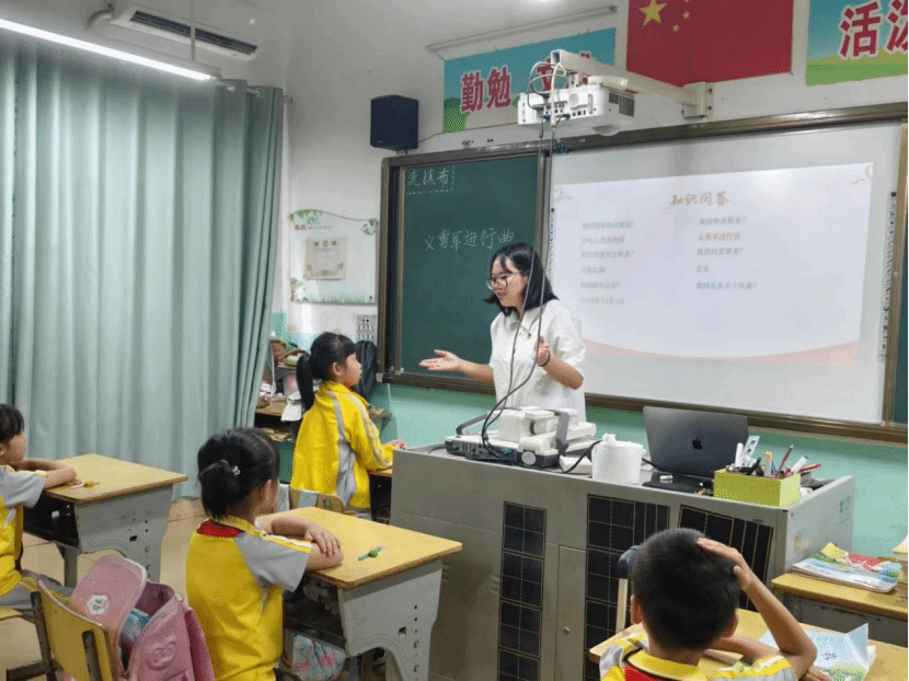 首先,宣讲人王荞茵以爱国知识抢答作为宣讲前的“热身”活动,调动了孩子们参与的积极性。孩子们争先恐后地举起自己的小手,积极地说出自己的答案,一张张小脸上洋溢着欢快的笑容。