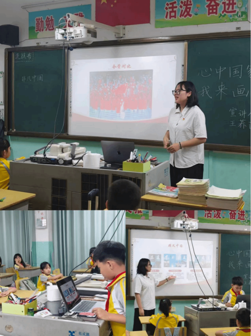 以匠心致初心,礼赞祖国壮美河山。宣讲人通过播放短片《中国人有多浪漫?》从科技到民生进一步将理论具象化,一幕幕现实中的场景呈现在孩子们眼前。在祖国崛起与发展的过程中,无数仁人志士投身于中华民族的伟大复兴事业。他是钱学森“虽千万人,吾往矣”的茫茫归家路,也是袁隆平投入半生的“禾下乘凉梦”。宣讲人向孩子们介绍了这两位前辈们的故事后,孩子们感恩祖国的心情更加迫切,便自告奋勇地上台与老师一起完成“心中国家”的绘制。