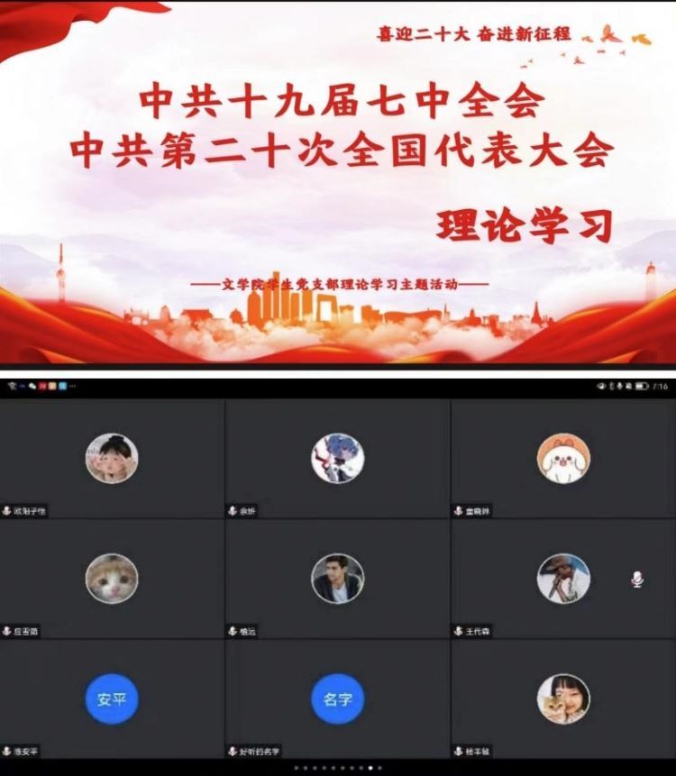 10月17日,文学院学生党支部组织传达学习贯彻党的十九届七中全会精神,同时开展中国共产党第二十次全国代表大会报告的学习研讨活动,全体学生党员及入党积极分子参会。学生党支部书记植远老师主持会议。