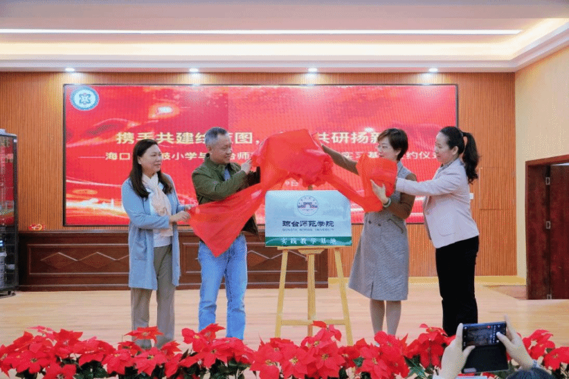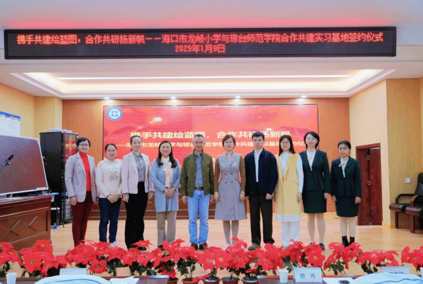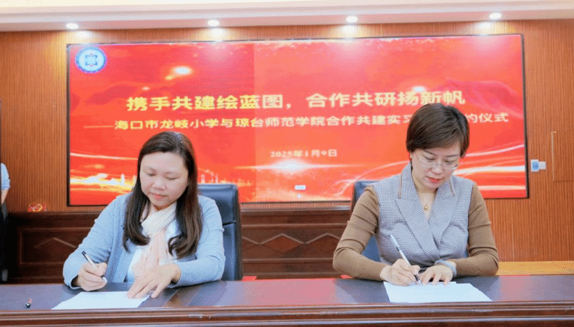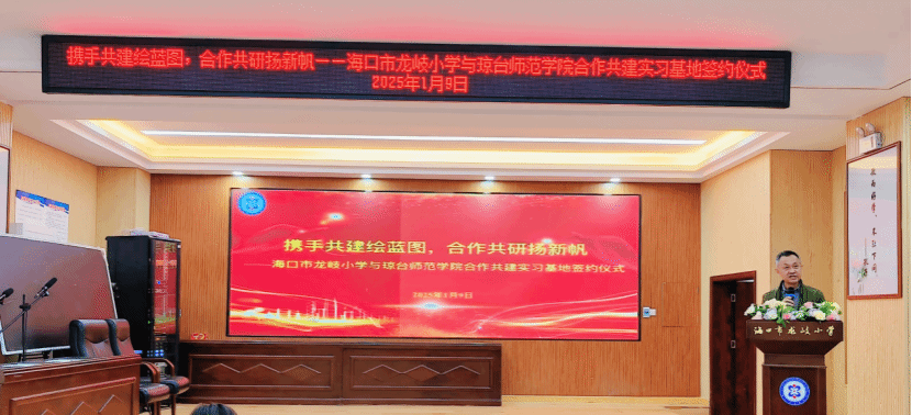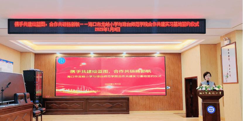 为推动我校教育教学改革和大学生社会实践活动长期化、规模化、阵地化,2025年1月9日上午,琼台师范学院与海口市龙岐小学举行合作共建实习基地签约仪式。签约仪式在海口市龙岐小学隆重举行,龙岐小学校长叶颜、副校长刘娟珠,海南省普通话与文字应用培训测试中心主任、国家语言文字推广基地(琼台师范学院)副主任、琼台师范学院文学院副院长蔡青,文学院副院长吴海超,中文系副主任吴正伟等出席签约仪式。