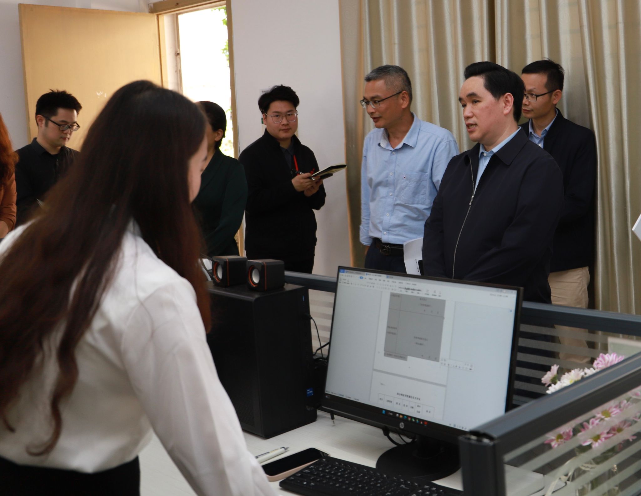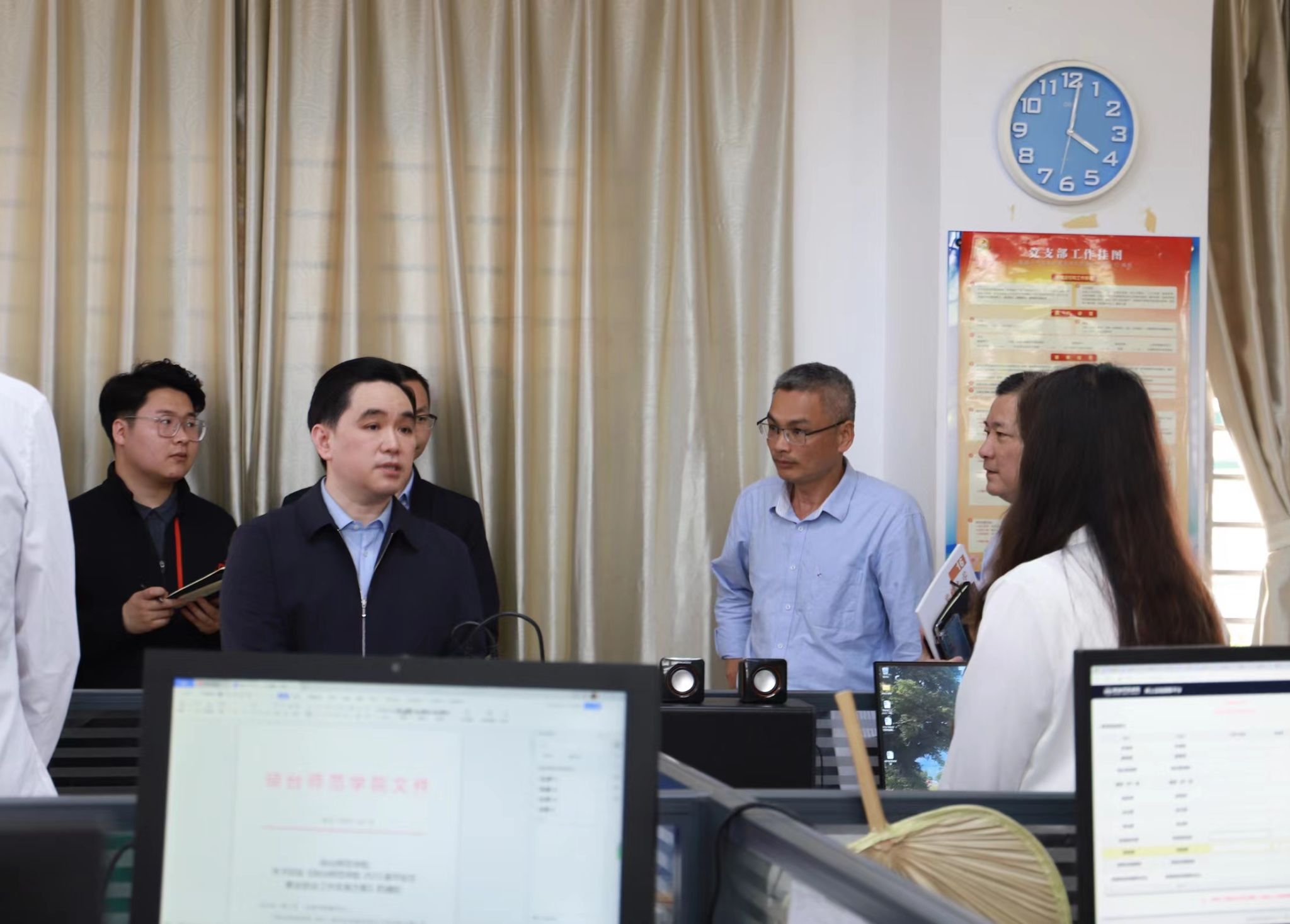 吕书记参观了文学院办公场地,看望了文学院辅导员,听取了文学院关于师资队伍、申报国家语言文字推广基地等工作的汇报。