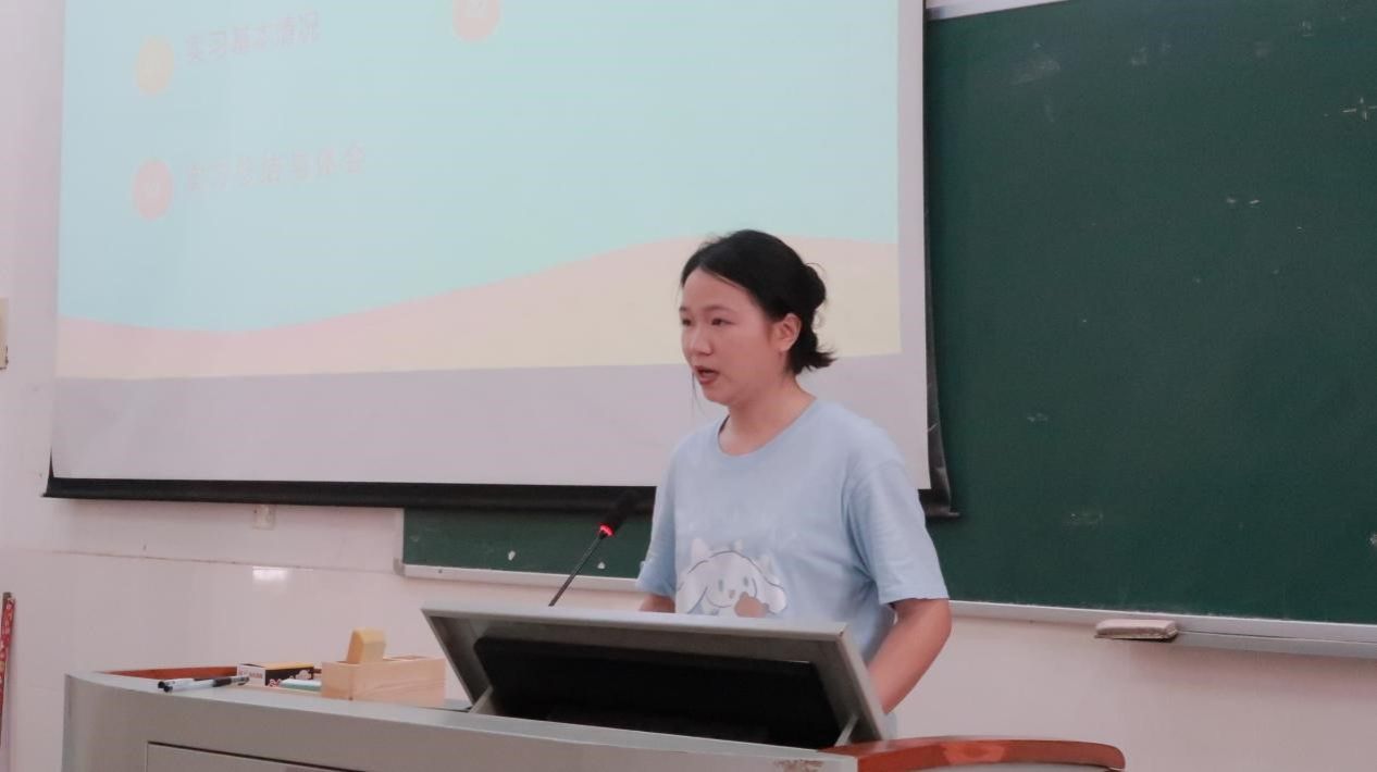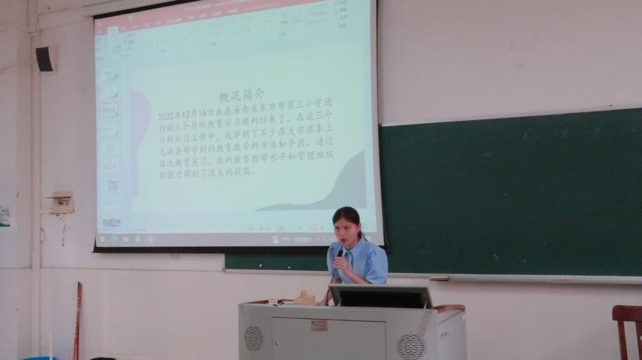 2019级汉语言文学1班符有领分享了自己在东方市第三小学为期三个月的实习经历。她表示,实习工作可以夯实自身专业知识,巩固专业技能,培养专业素养。在实习过程中,符有领同学也深深地感受到学院领导和老师对实习同学的关心和指导,通过点滴分享让大家对实习有了更加全面的认识。