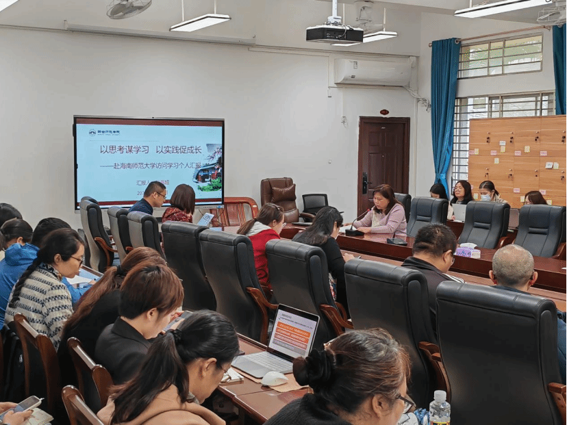 2024年2月27日下午3点,文学院副院长吴海超在文B103会议室向文学院全体教职工做了一场精彩的访学汇报,她以“以思考谋学习,以实践促成长”为主题,分享了她近期在海南师范大学的访学经历和收获。