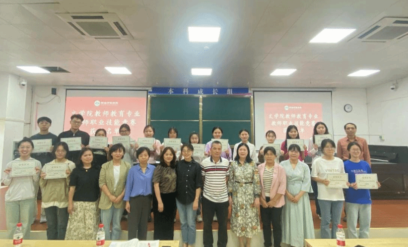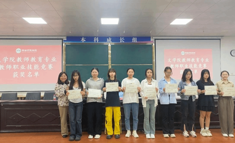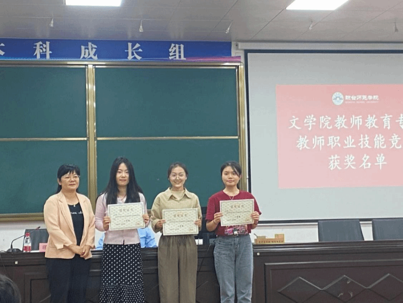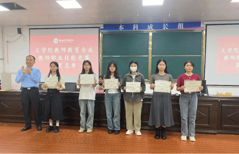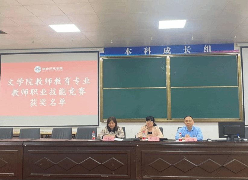 会议第二项内容,由邢满院长宣读文学院教师教育专业教师职业技能竞赛获奖名单以及优秀实习生名单。并由符永书记、邢满院长、吴海超副院长为文学院教师教育专业教师职业技能竞赛获奖学生以及优秀实习生颁发奖状。