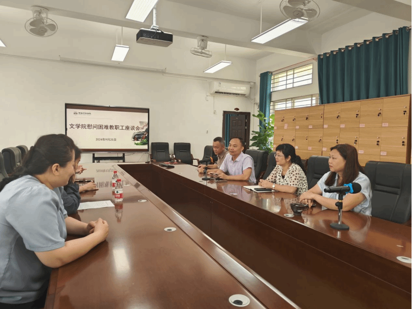为关心和支持困难教职工,文学院于2024年9月25日在学院文B103会议室召开了慰问困难教职工座谈会。学院党委书记符永、学院院长邢满、学院副院长蔡青、吴海超、工会委员张丽花、马中力及困难教职工孙雪梅、潘虹两位辅导员参加了本次座谈会。