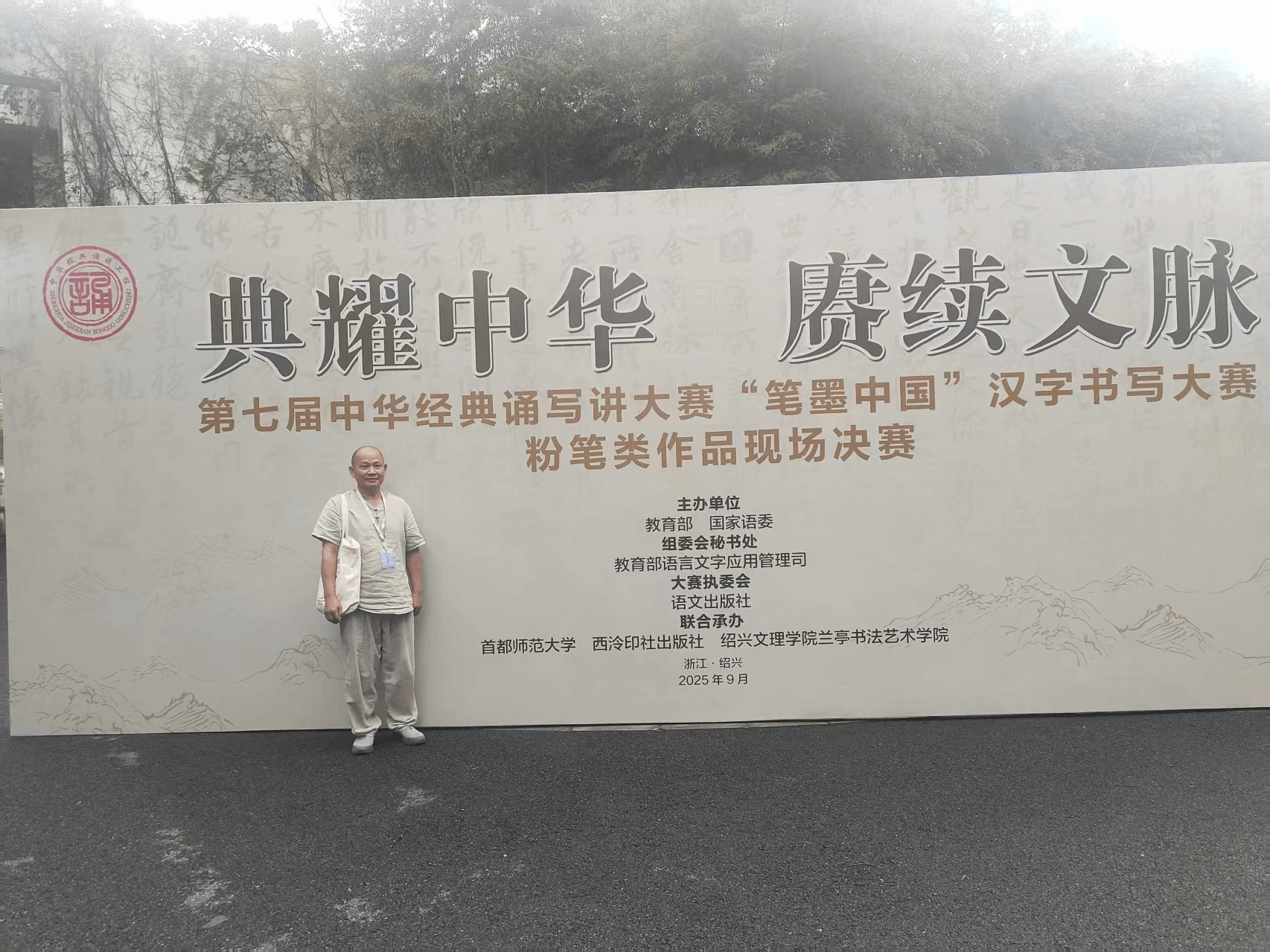 2025年9月21日,由教育部、国家语委主办的第七届中华经典诵写讲大赛“笔墨中国”汉字书写大赛粉笔类作品现场决赛,在素有“书法圣地”之称的绍兴文理学院兰亭书法艺术学院隆重举行。来自全国各地的180余名书法精英汇聚一堂,同场竞技,共同演绎粉笔书法的独特魅力。我院王斌老师作为海南省代表之一,参与了此次全国最高水平的粉笔书写角逐,并获得二等奖的好成绩。