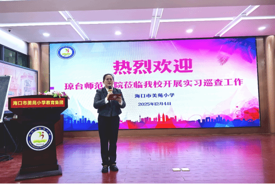 为深化校际合作,加强教育实践环节,2025年12月4日,琼台师范学院实习工作巡查暨交流活动在海口市美苑小学顺利举行。琼台师范学院文学院副院长吴海超、教师代表周燕、吴皖琼、实习带队老师杨佳及28名实习生,与美苑小学校长王虎、校级领导班子、中层管理干部及实习指导教师代表齐聚一堂,共话师范生培养与教育实践成果。