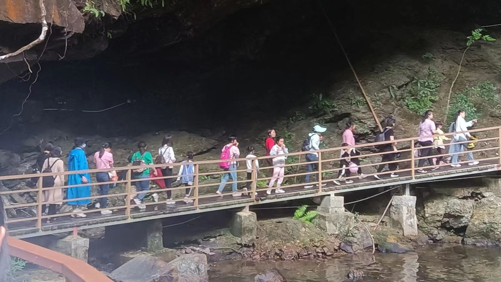 研学活动第一站是琼海的石壁瀑布。参加研学活动的孩子们在研学导师的带领下参观了飞驰而下的瀑布,不仅在瀑布前纷纷拍照留念,还顺着一路延伸到瀑布下游的木栈道走到水帘的后面,360°环绕式的观感体验,不禁让研学的孩子吟诵出“飞流直下三千尺,疑是银河落九天”的千古佳句。