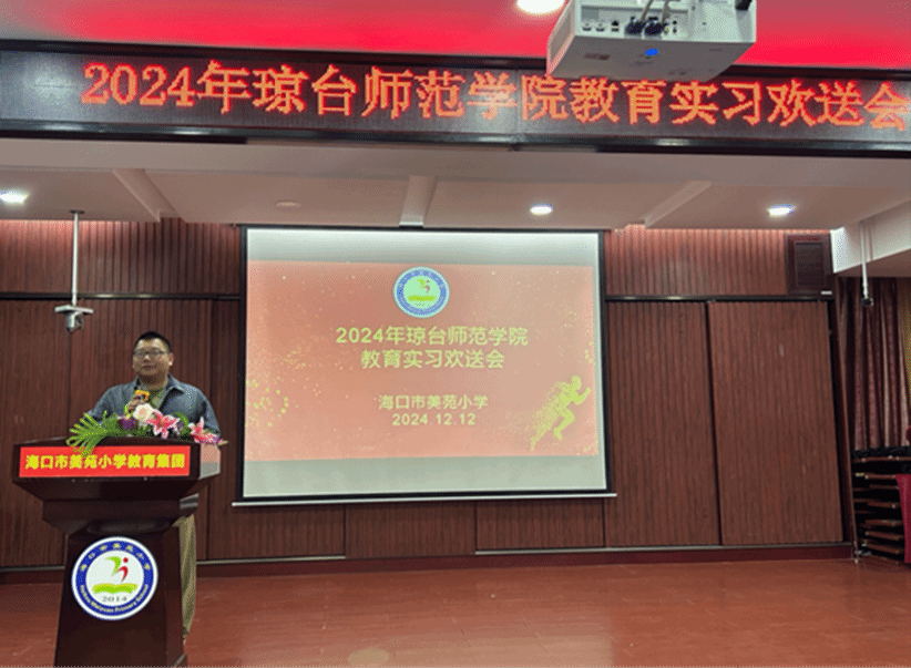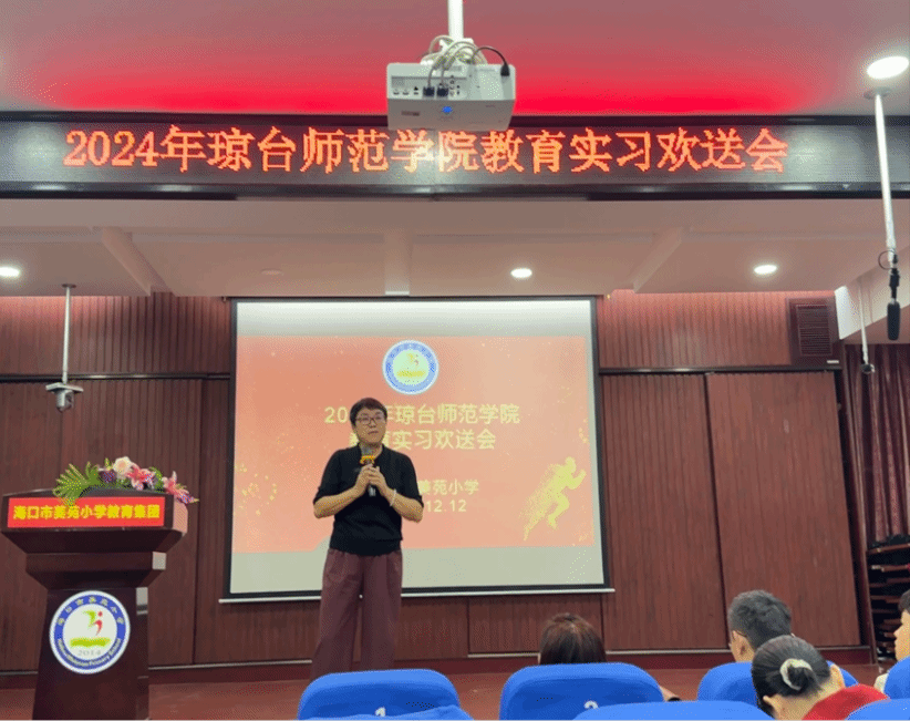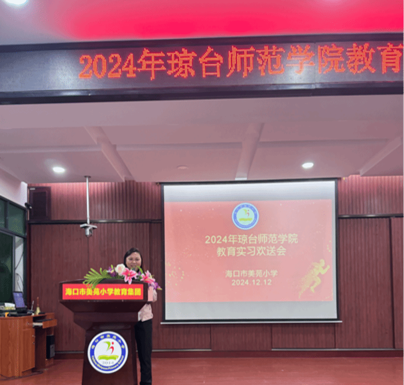 2024年12月12日下午,美苑小学在二楼多功能报告厅举行了一场温馨而隆重的实习生欢送会。美苑小学校长魏淑平、副校长李麟、副校长许雪芳、美苑小学教育集团副书记文有思、教导主任云青、全体实习指导教师;琼台师范学院文学院吴海超副院长、实习带队教师吴彦、汉语国际教育专业教师吴皖琼出席了此次欢送会。
