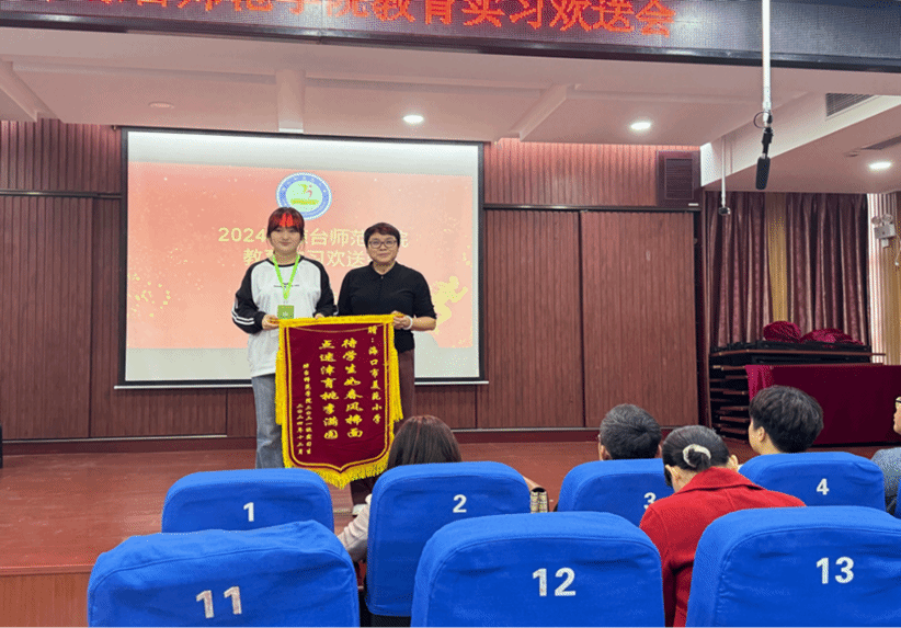 实习生代表窦彬鲡同学为美苑小学赠送锦旗,为实习指导教师代表送上了精心准备的纪念品,以表达对实习期间指导老师的辛勤培育和关怀教导的感激之情。